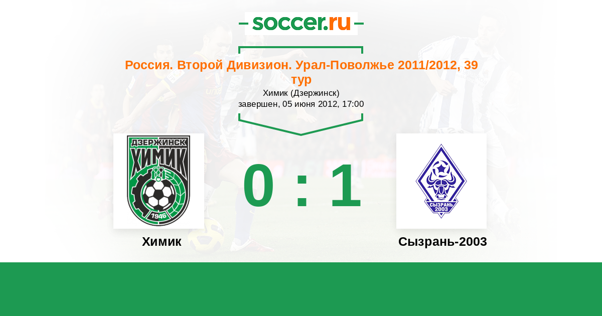 Россия. Вторая лига. Группа 4 29.09.2011 Сызрань-2003 Логотип футбольный клуб Сызрань-2003 3:0 Логотип футбольный клуб Химик (Дзержинск) Химик