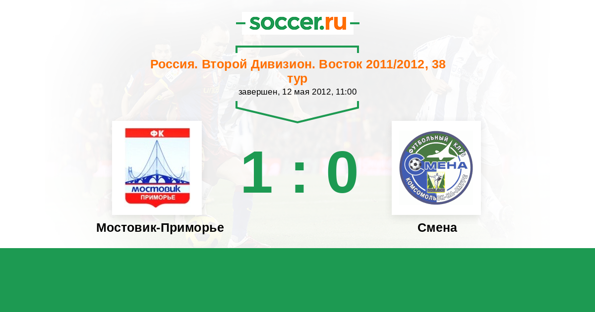 Россия. 2-й дивизион. Восток 12.05.2012 Мостовик-Приморье Логотип футбольный клуб Мостовик-Приморье (Уссурийск) 1:0 Логотип футбольный клуб Смена (Комсомольск-на-Амуре) Смена