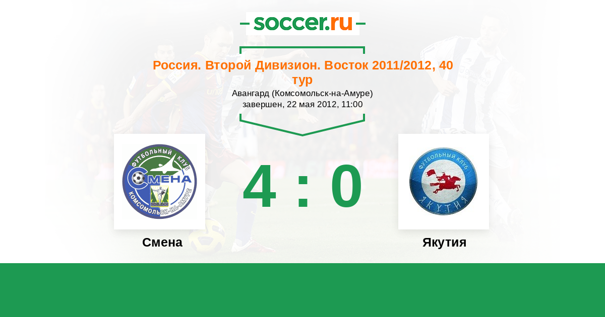 Россия. 2-й дивизион. Восток 20.06.2011 Смена Логотип футбольный клуб Смена (Комсомольск-на-Амуре) 2:2 Логотип футбольный клуб Якутия (Якутск) Якутия