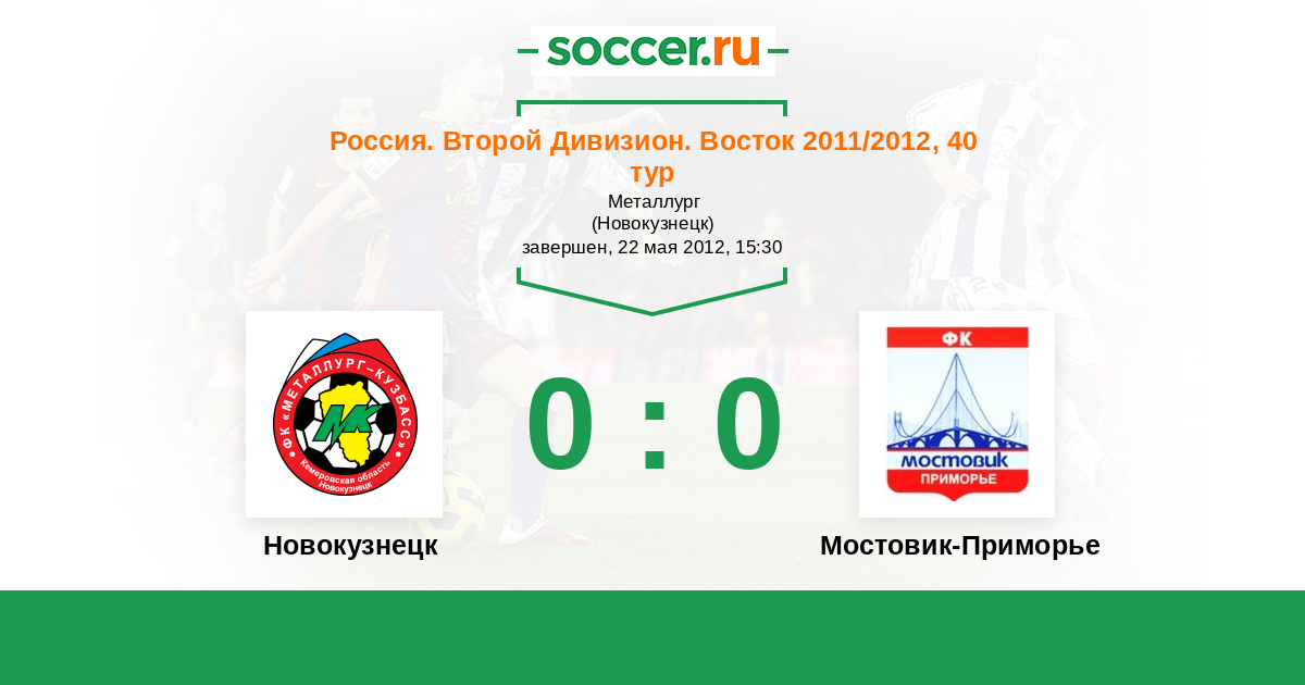 Россия. 2-й дивизион. Восток 21.07.2011 Мостовик-Приморье Логотип футбольный клуб Мостовик-Приморье (Уссурийск) 1:0 Логотип футбольный клуб Металлург-Кузбасс (Новокузнецк) Металлург-Кузбасс