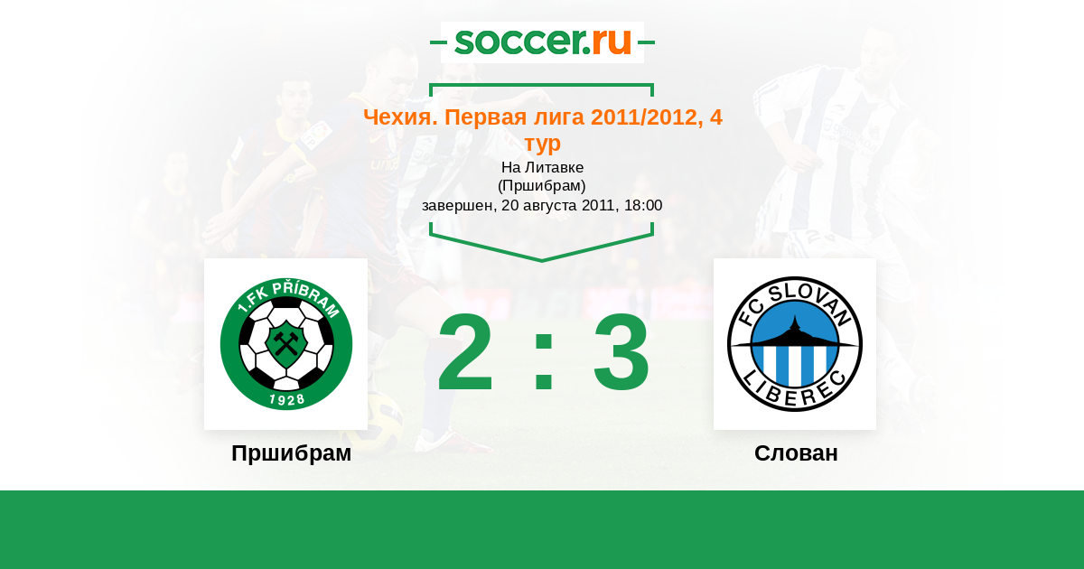 Чехия. Первая Лига 28.07.2012 Пршибрам Логотип футбольный клуб Пршибрам 0:4 Логотип футбольный клуб Слован (Либерец) Слован