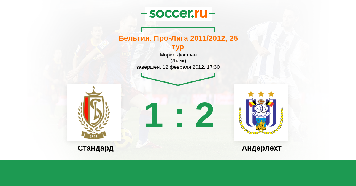 Бельгия. Про-Лига 06.04.2012 Стандард Логотип футбольный клуб Стандард (Льеж) 0:0 Логотип футбольный клуб Андерлехт (Брюссель) Андерлехт