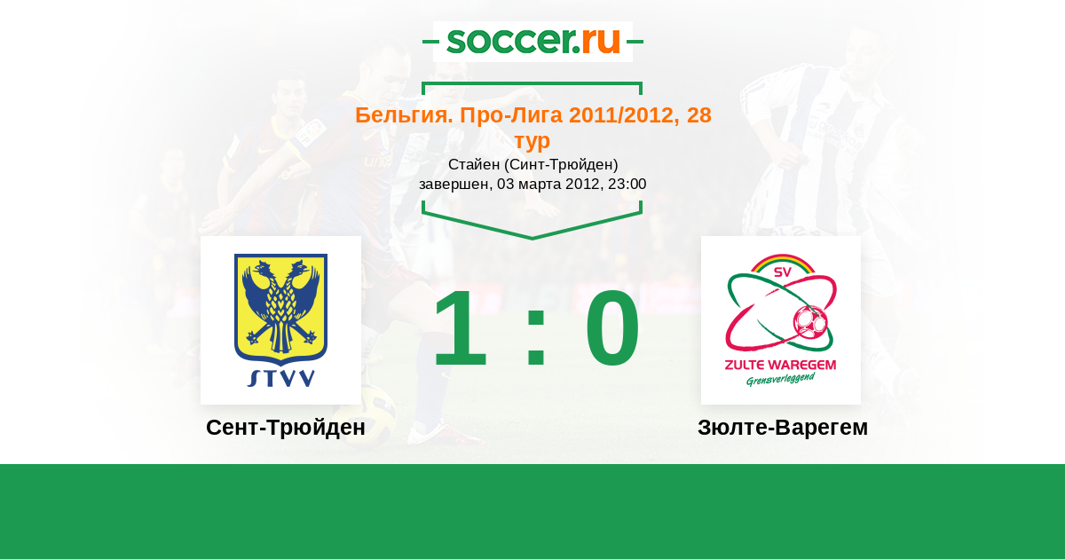Бельгия. Про-Лига 12.03.2011 Зюлте-Варегем Логотип футбольный клуб Зюлте-Варегем 1:2 Логотип футбольный клуб Сент-Трюйден (Синт-Трёйден) Сент-Трюйден