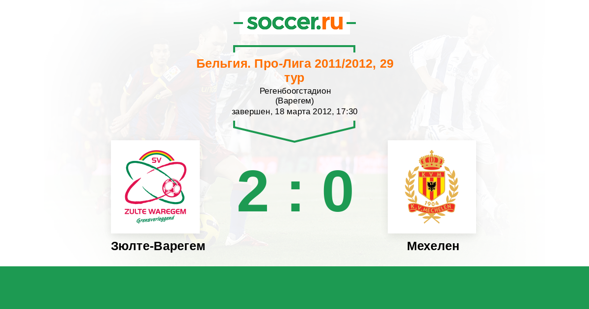 Бельгия. Про-Лига 21.03.2010 Мехелен Логотип футбольный клуб Мехелен 2:1 Логотип футбольный клуб Зюлте-Варегем Зюлте-Варегем