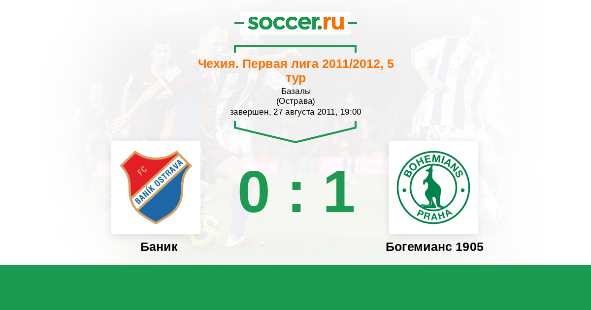 Чехия. Первая Лига 05.03.2012 Богемианс 1905 Логотип футбольный клуб Богемианс 1905 (Прага) 0:1 Логотип футбольный клуб Баник (Острава) Баник