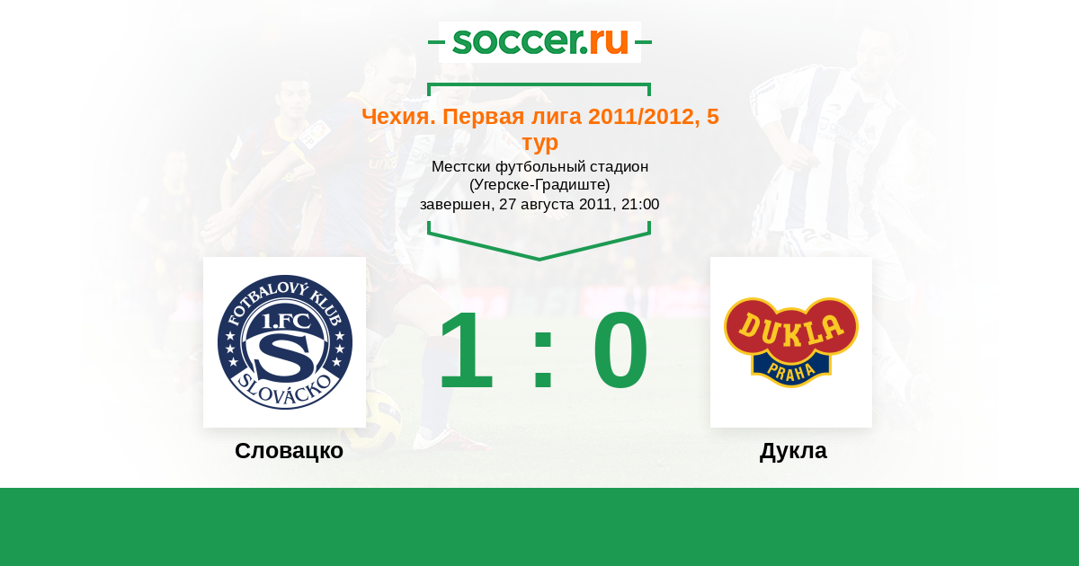 Чехия. Первая Лига 17.08.2012 Дукла Логотип футбольный клуб Дукла (Прага) 2:2 Логотип футбольный клуб Словацко (Угерске-Градиште) Словацко