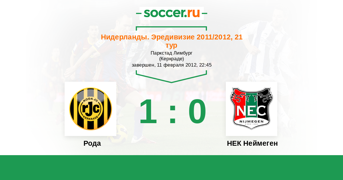 Нидерланды. Эредивизи 26.10.2010 Рода Логотип футбольный клуб Рода (Керкраде) 1:1 Логотип футбольный клуб НЕК Неймеген НЕК Неймеген