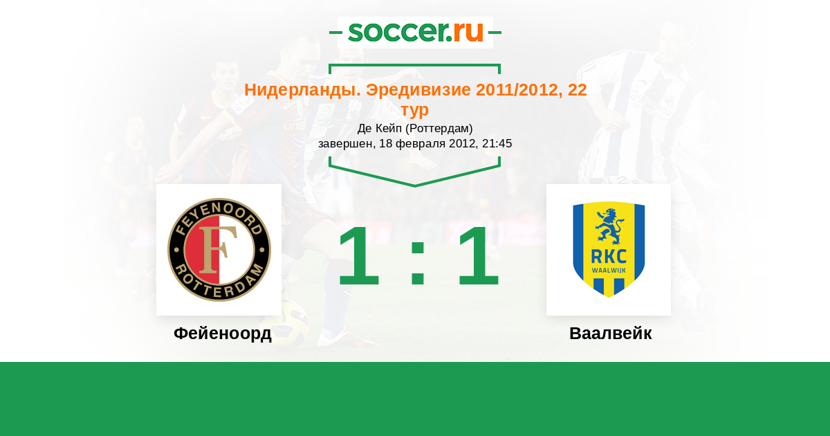 Нидерланды. Эредивизи 27.11.2011 Ваалвейк Логотип футбольный клуб Ваалвейк (Валвейк) 1:2 Логотип футбольный клуб Фейеноорд (Роттердам) Фейеноорд