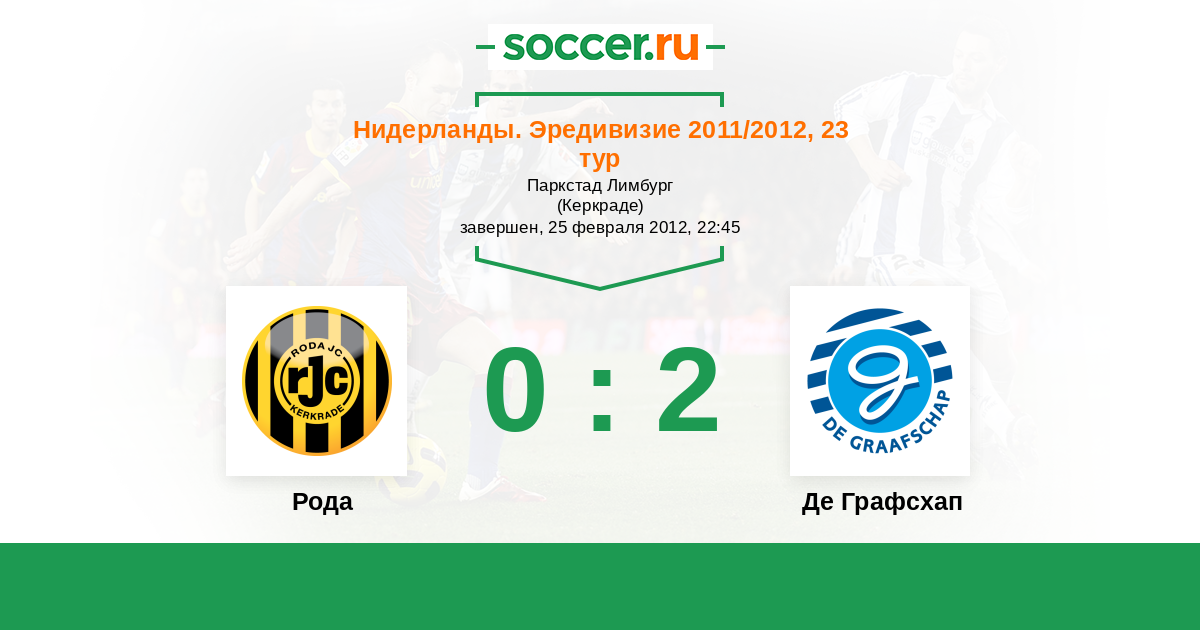 Нидерланды. Эредивизи 26.02.2011 Рода Логотип футбольный клуб Рода (Керкраде) 1:1 Логотип футбольный клуб Де Графсхап (Дутинхем) Де Графсхап