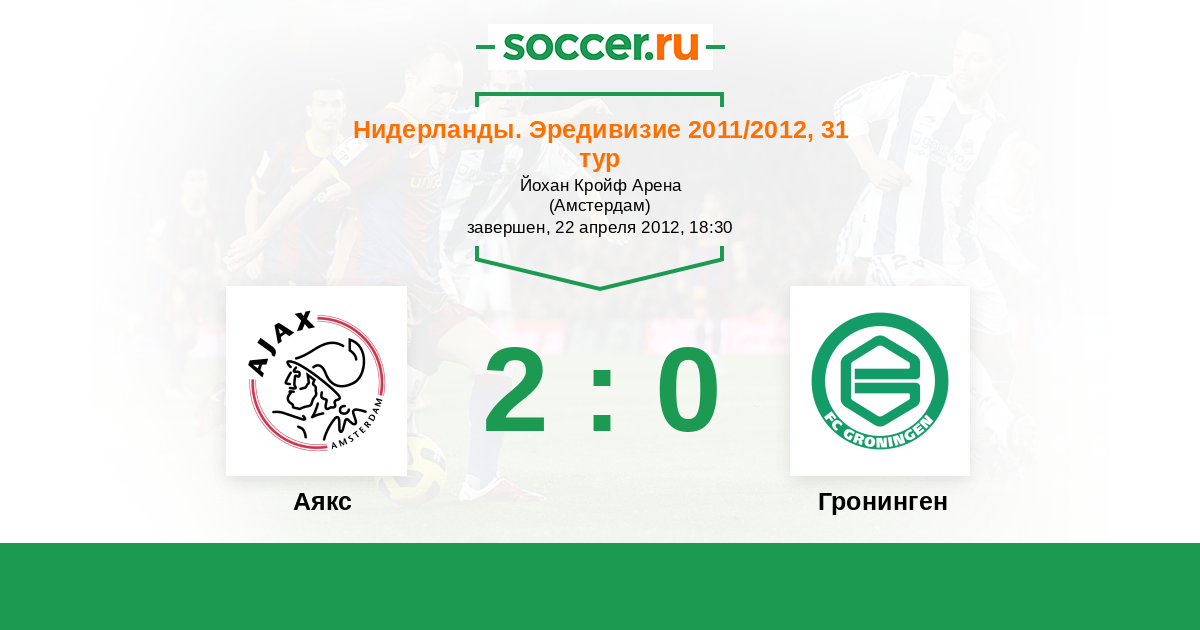 Нидерланды. Эредивизи 10.04.2011 Аякс Логотип футбольный клуб Аякс (Амстердам) 2:0 Логотип футбольный клуб Гронинген Гронинген