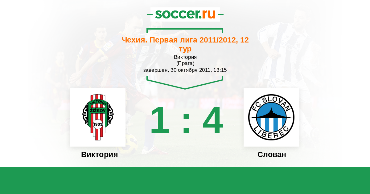 Чехия. Первая Лига 20.04.2012 Слован Логотип футбольный клуб Слован (Либерец) 4:0 Логотип футбольный клуб Виктория (Жижков) Виктория