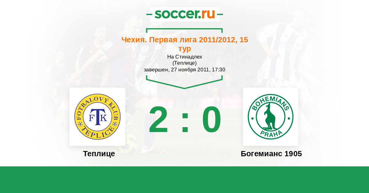 Чехия. Первая Лига 12.09.2015 Теплице Логотип футбольный клуб Теплице 2:1 Логотип футбольный клуб Богемианс 1905 (Прага) Богемианс 1905