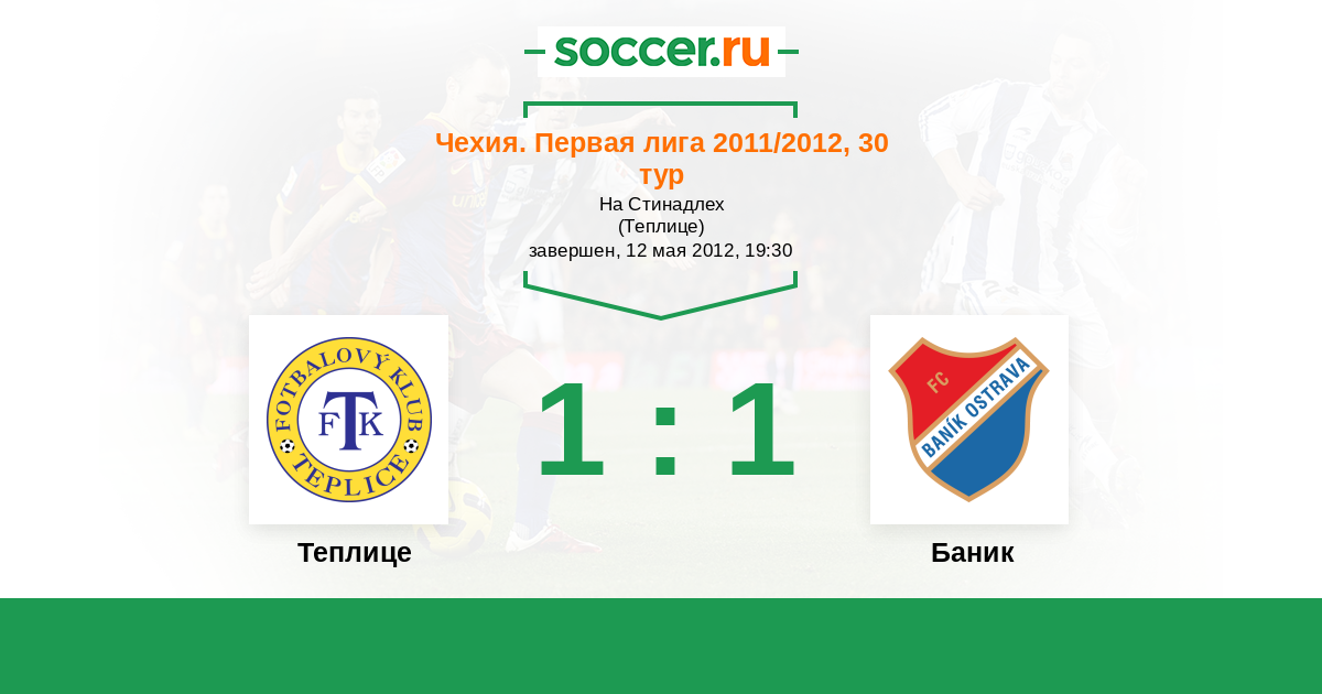 Чехия. Первая Лига 30.07.2011 Баник Логотип футбольный клуб Баник (Острава) 3:4 Логотип футбольный клуб Теплице Теплице