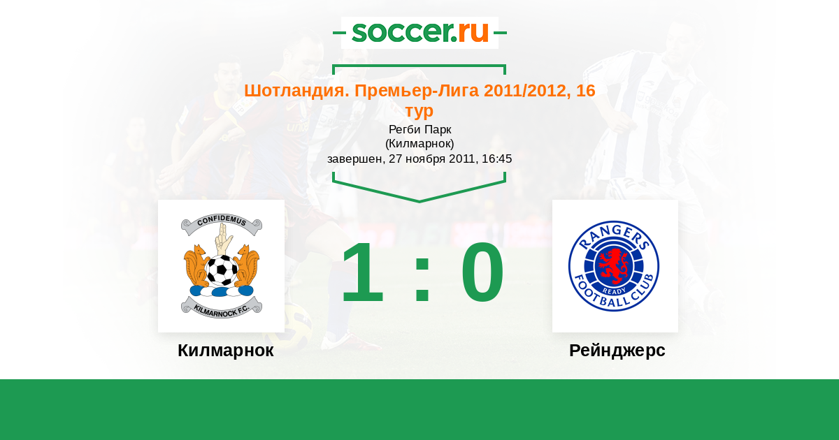 Шотландия. Премьер-Лига 18.02.2012 Рейнджерс Логотип футбольный клуб Рейнджерс (Глазго) 0:1 Логотип футбольный клуб Килмарнок Килмарнок