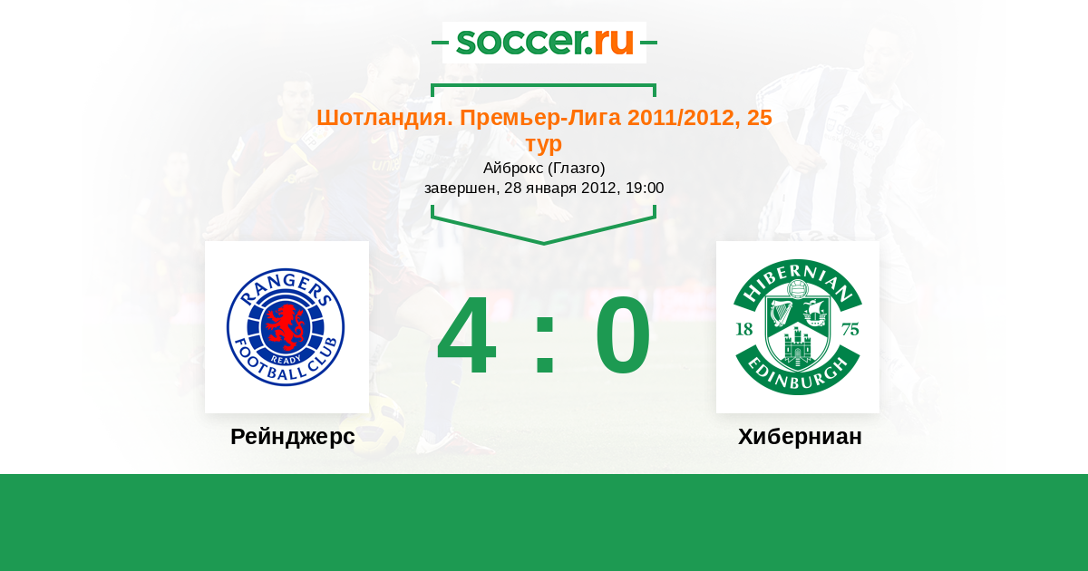 Шотландия. Премьер-Лига 10.12.2011 Хиберниан Логотип футбольный клуб Хиберниан (Эдинбург) 0:2 Логотип футбольный клуб Рейнджерс (Глазго) Рейнджерс