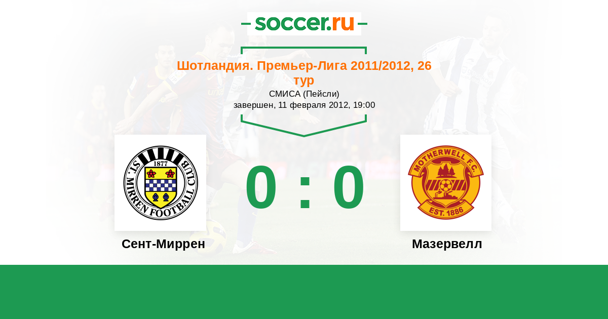 Шотландия. Премьер-Лига 17.12.2011 Мазервелл Логотип футбольный клуб Мазервелл 1:1 Логотип футбольный клуб Сент-Миррен (Пейсли) Сент-Миррен