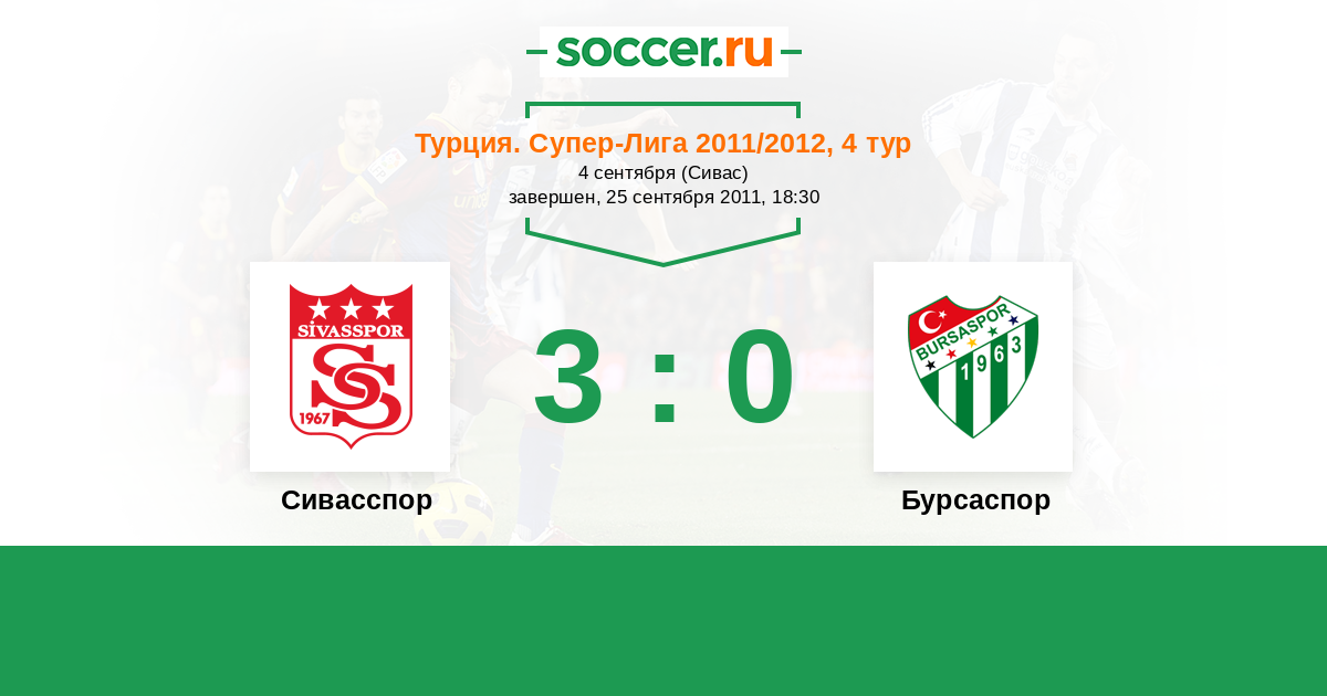 Турция. Суперлига 15.04.2012 Сивасспор Логотип футбольный клуб Сивасспор 4:0 Логотип футбольный клуб Бурсаспор Бурсаспор