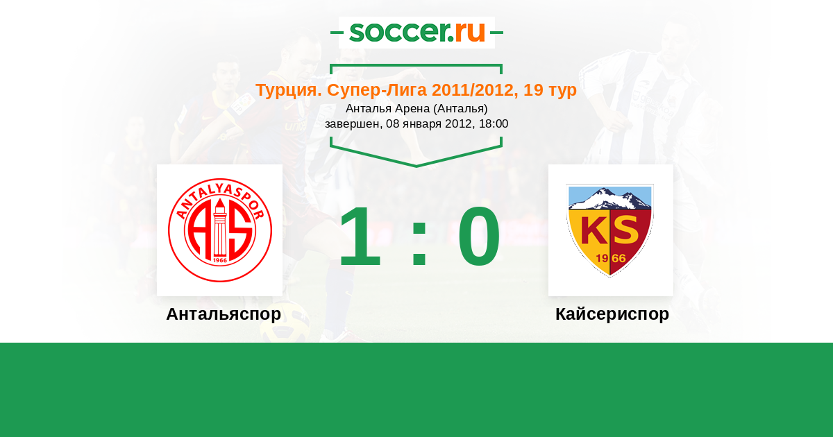 Турция. Суперлига 27.08.2012 Антальяспор Логотип футбольный клуб Антальяспор 3:0 Логотип футбольный клуб Кайсериспор Кайсериспор