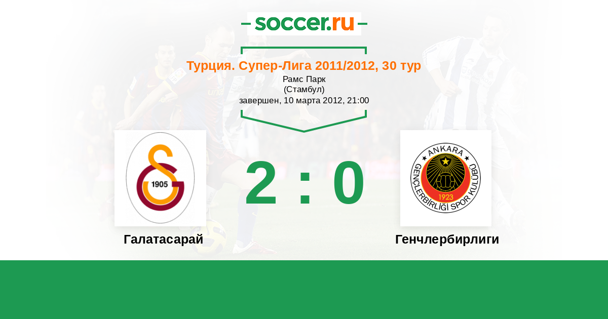 Турция. Суперлига 03.12.2011 Генчлербирлиги Логотип футбольный клуб Генчлербирлиги (Анкара) 0:1 Логотип футбольный клуб Галатасарай (Стамбул) Галатасарай