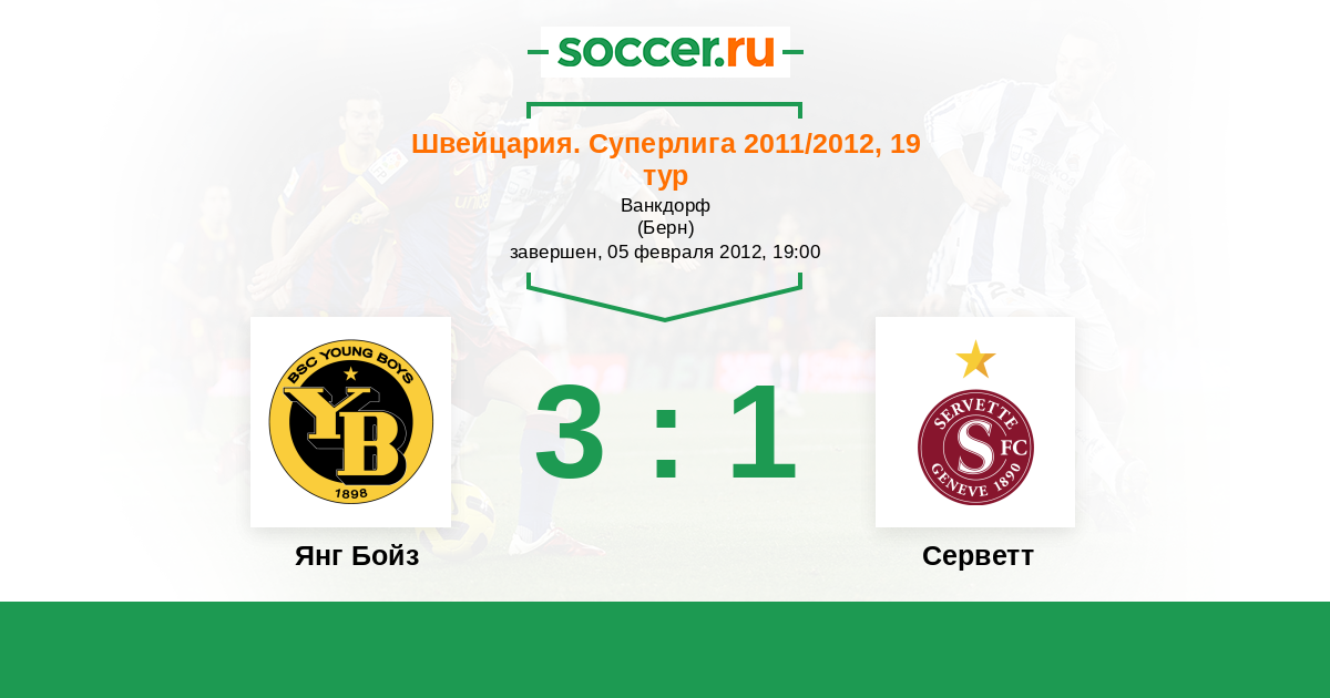 Швейцария. Суперлига 28.04.2012 Серветт Логотип футбольный клуб Серветт (Женева) 2:1 Логотип футбольный клуб Янг Бойз (Берн) Янг Бойз