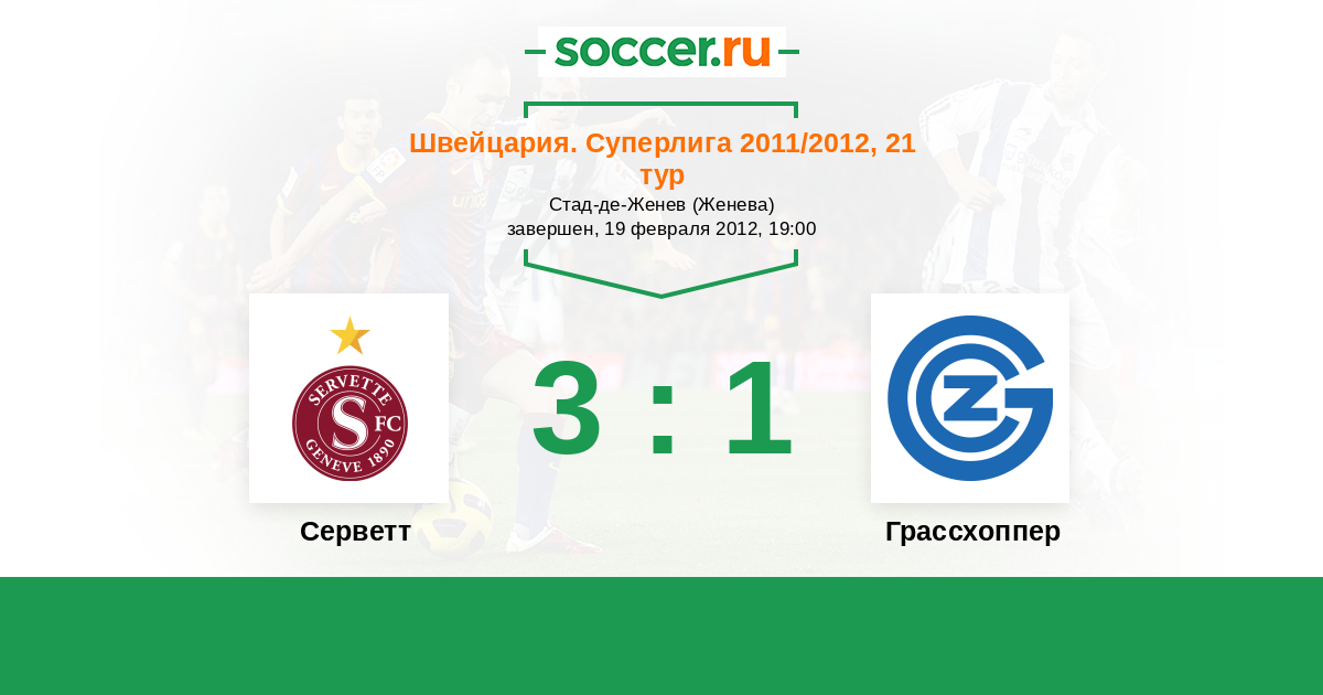 Швейцария. Суперлига 02.05.2012 Грассхоппер Логотип футбольный клуб Грассхоппер (Цюрих) 0:3 Логотип футбольный клуб Серветт (Женева) Серветт