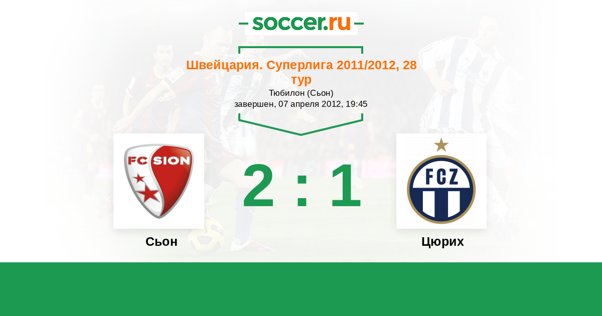 Швейцария. Суперлига 16.04.2011 Сьон Логотип футбольный клуб Сьон 0:2 Логотип футбольный клуб Цюрих Цюрих