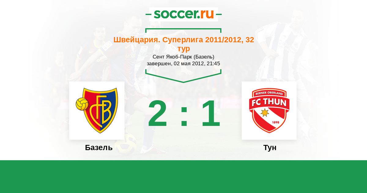 Швейцария. Суперлига 31.03.2012 Тун Логотип футбольный клуб Тун 2:3 Логотип футбольный клуб Базель Базель