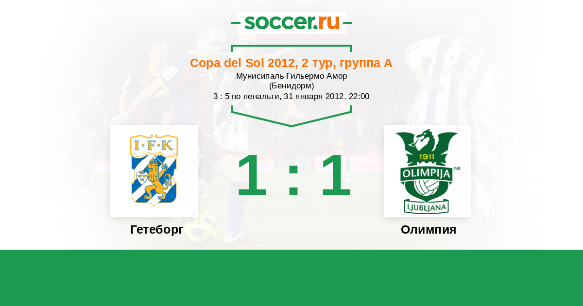 Копа дель Соль 28.01.2013 Олимпия Логотип футбольный клуб Олимпия (Любляна) 0:0 (3:2) Логотип футбольный клуб Гетеборг Гетеборг