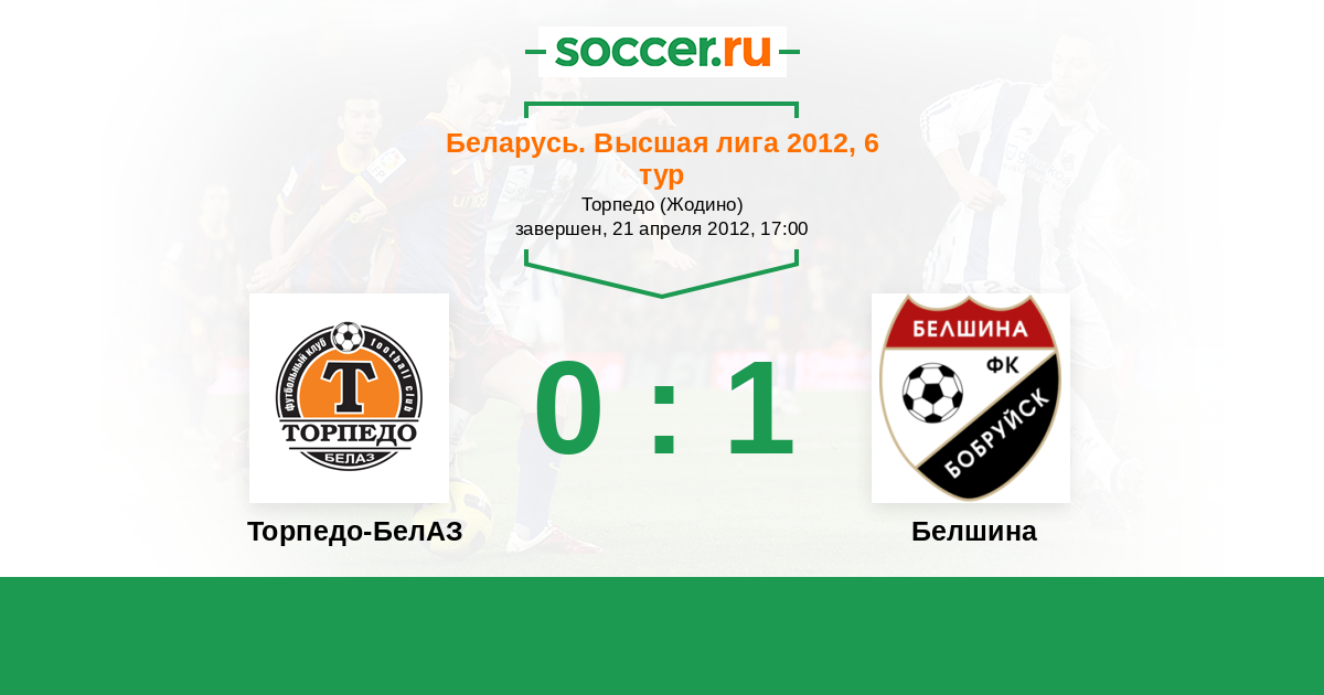 Беларусь. Высшая лига 01.07.2012 Белшина Логотип футбольный клуб Белшина (Бобруйск) 0:0 Логотип футбольный клуб Торпедо-БелАЗ (Жодино) Торпедо-БелАЗ