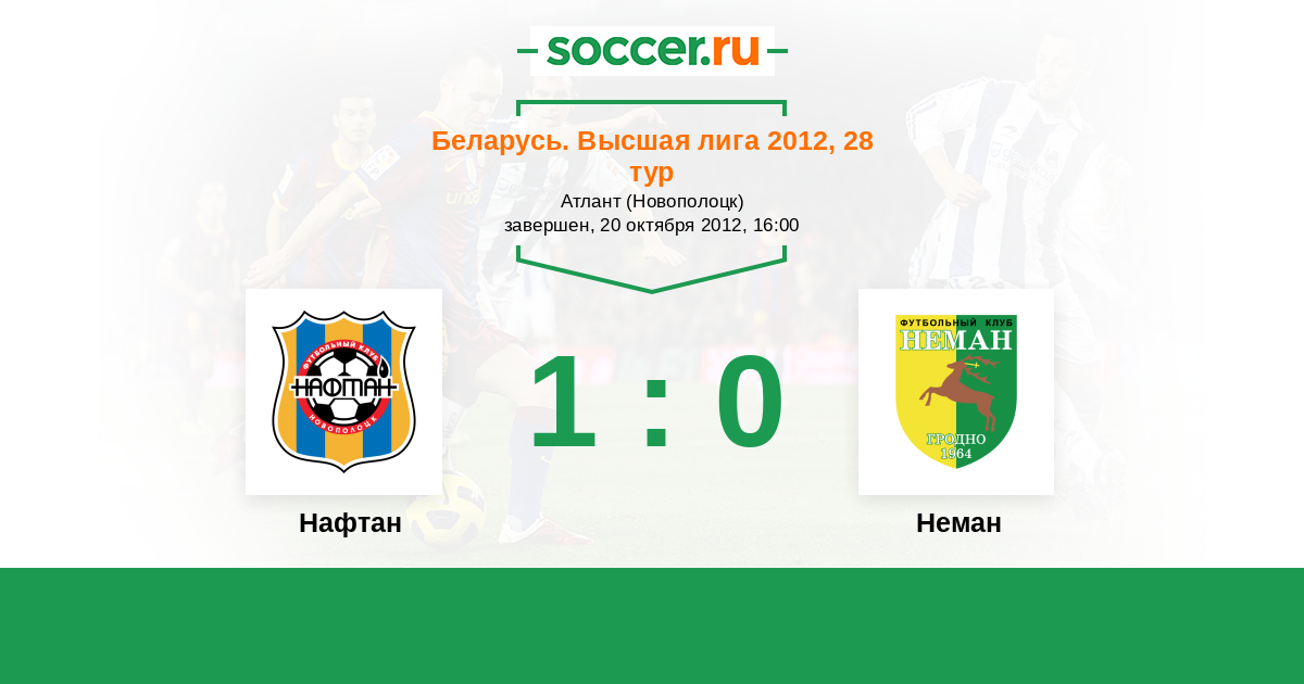 Беларусь. Высшая лига 18.08.2012 Неман Логотип футбольный клуб Неман (Гродно) 3:0 Логотип футбольный клуб Нафтан (Новополоцк) Нафтан