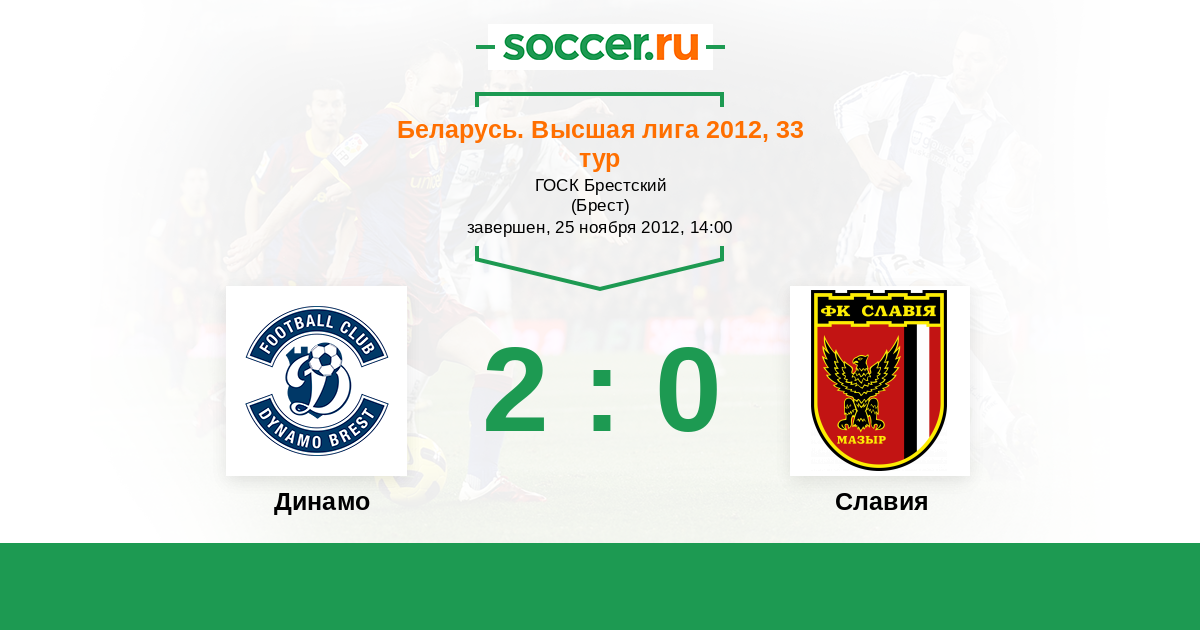 Беларусь. Высшая лига 12.05.2012 Славия Логотип футбольный клуб Славия (Мозырь) 2:1 Логотип футбольный клуб Динамо (Брест) Динамо