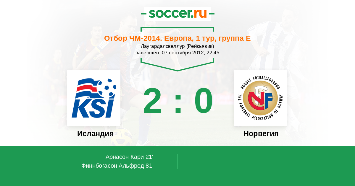 81' (2:0) Финнбогасон Альфред (19) (Сигурдссон Гильфи (10))