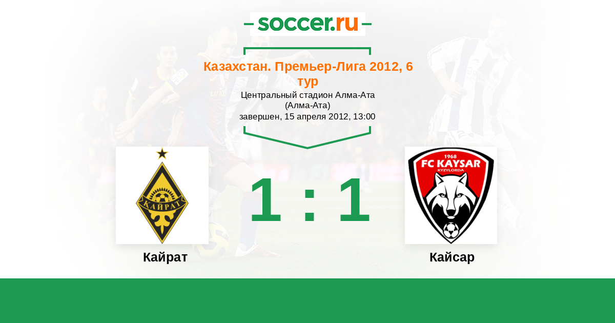 Казахстан. Премьер-лига 29.07.2012 Кайсар Логотип футбольный клуб Кайсар (Кызылорда) 1:1 Логотип футбольный клуб Кайрат (Алматы) Кайрат