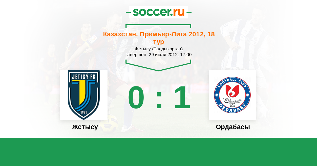 Казахстан. Премьер-лига 18.07.2010 Ордабасы Логотип футбольный клуб Ордабасы (Шымкент) 2:1 Логотип футбольный клуб Жетысу (Талдыкорган) Жетысу