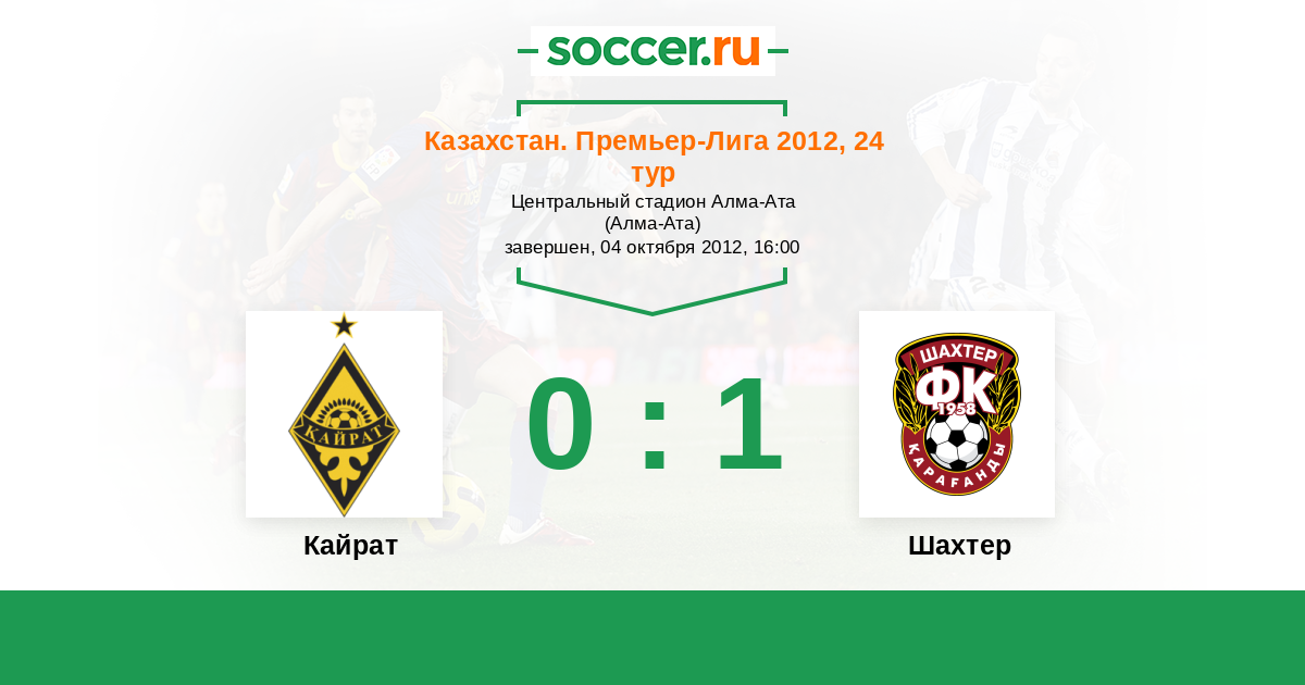 Казахстан. Премьер-лига 27.05.2012 Шахтер Логотип футбольный клуб Шахтер (Караганда) 4:1 Логотип футбольный клуб Кайрат (Алматы) Кайрат