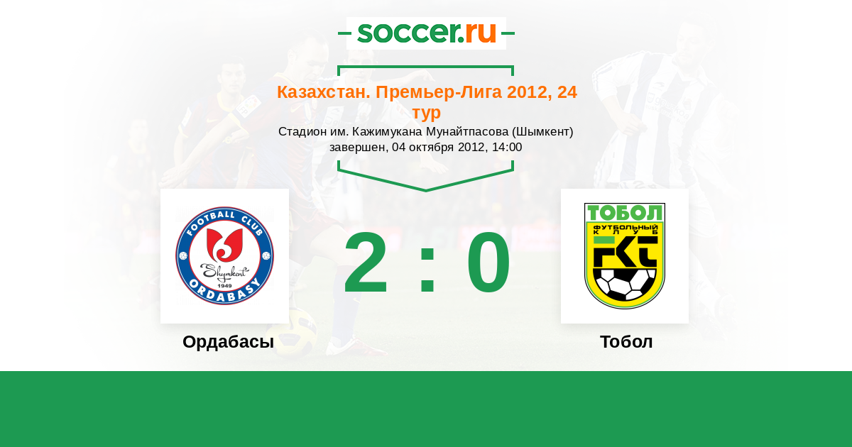 Казахстан. Премьер-лига 27.05.2012 Тобол Логотип футбольный клуб Тобол (Костанай) 1:0 Логотип футбольный клуб Ордабасы (Шымкент) Ордабасы