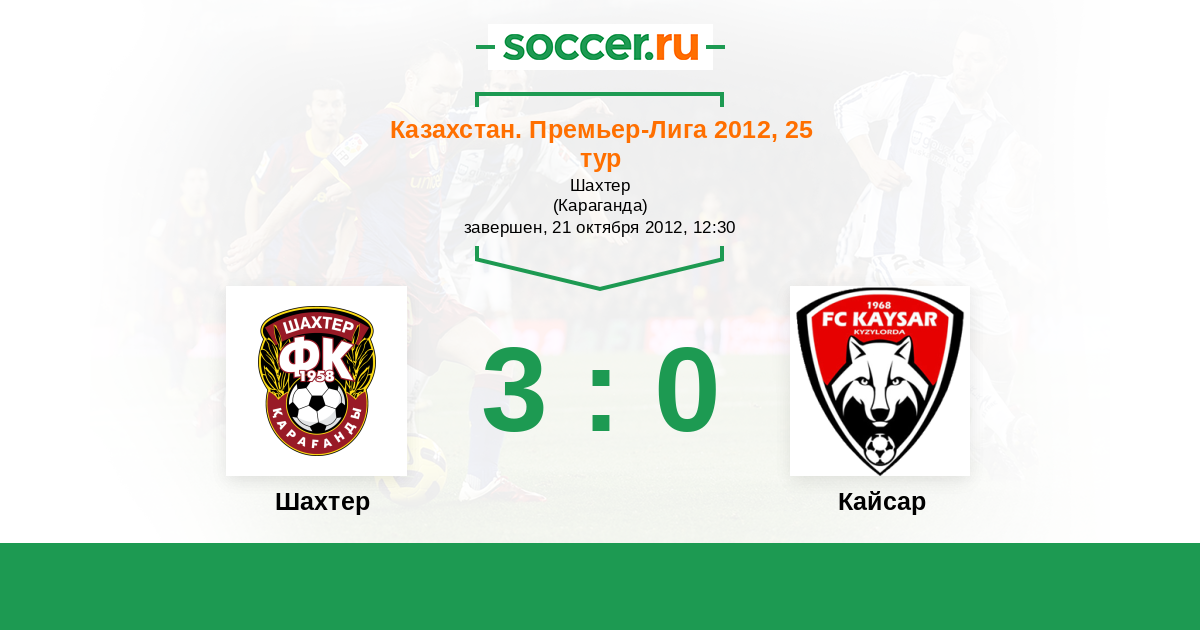 Казахстан. Премьер-лига 16.06.2012 Кайсар Логотип футбольный клуб Кайсар (Кызылорда) 1:0 Логотип футбольный клуб Шахтер (Караганда) Шахтер