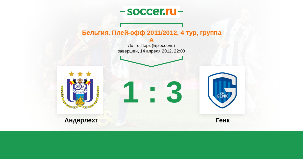 Бельгия. Про-Лига 27.04.2012 Генк Логотип футбольный клуб Генк 0:4 Логотип футбольный клуб Андерлехт (Брюссель) Андерлехт