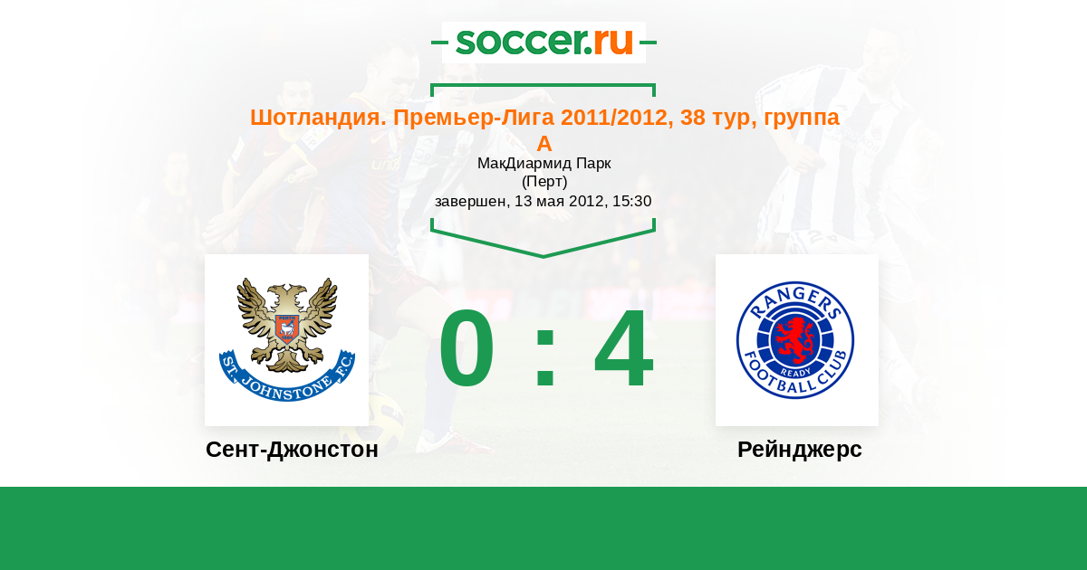 Шотландия. Премьер-Лига 05.04.2011 Сент-Джонстон Логотип футбольный клуб Сент-Джонстон (Перт) 0:2 Логотип футбольный клуб Рейнджерс (Глазго) Рейнджерс