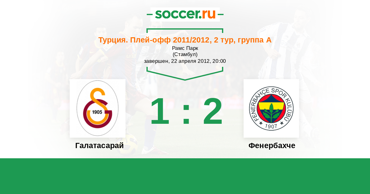 Турция. Суперлига 17.03.2012 Фенербахче Логотип футбольный клуб Фенербахче (Стамбул) 2:2 Логотип футбольный клуб Галатасарай (Стамбул) Галатасарай