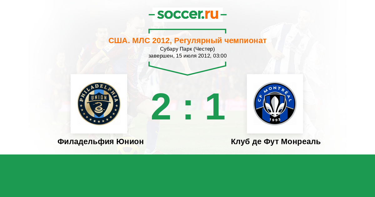 США. МЛС 05.08.2012 Клуб де Фут Монреаль Логотип футбольный клуб Клуб де Фут Монреаль 2:0 Логотип футбольный клуб Филадельфия Юнион Филадельфия Юнион