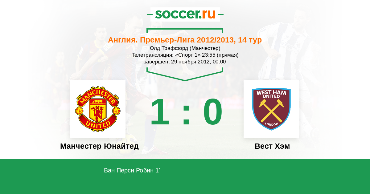 1' (1:0) Ван Перси Робин (20) (Каррик Майкл (16))