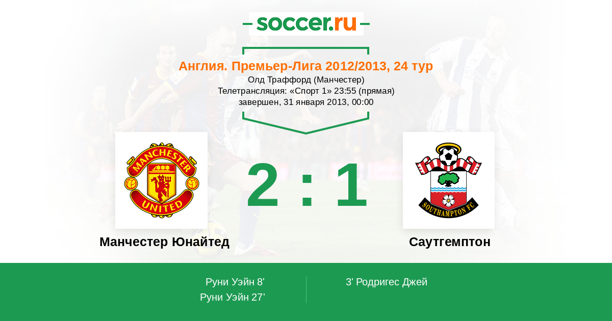 27' (2:1) Руни Уэйн (10) (Эвра Патрис (3))