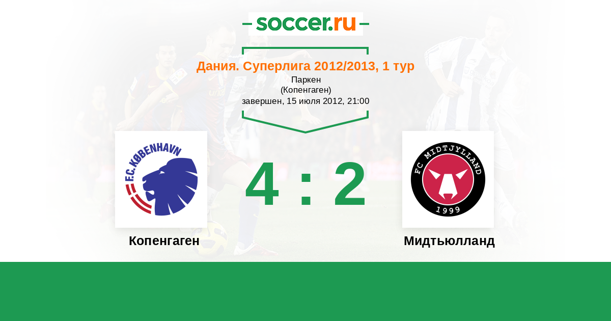 Дания. Суперлига 28.07.2013 Мидтьюлланд Логотип футбольный клуб Мидтьюлланд (Хернинг) 1:0 Логотип футбольный клуб Копенгаген Копенгаген