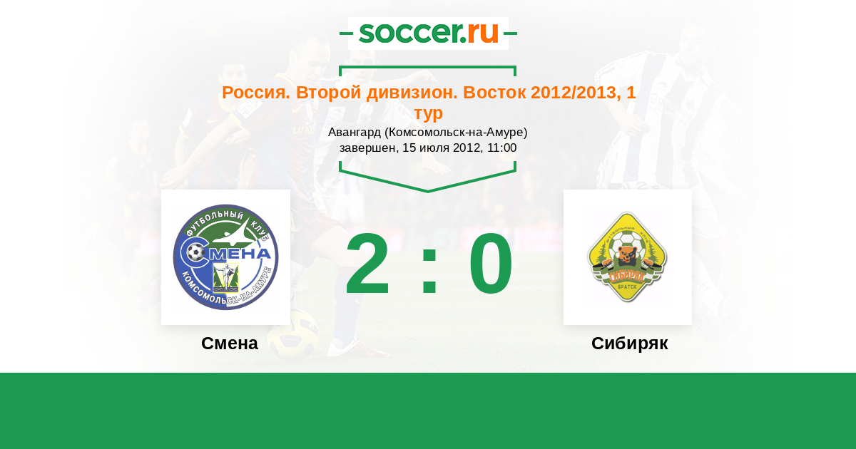 Россия. 2-й дивизион. Восток 15.07.2010 Смена Логотип футбольный клуб Смена (Комсомольск-на-Амуре) 0:1 Логотип футбольный клуб Сибиряк (Братск) Сибиряк