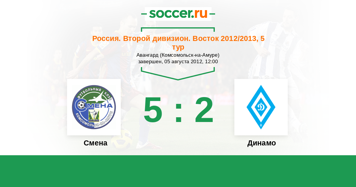 Россия. 2-й дивизион. Восток 29.04.2012 Смена Логотип футбольный клуб Смена (Комсомольск-на-Амуре) 1:1 Логотип футбольный клуб Динамо Барнаул Динамо Барнаул