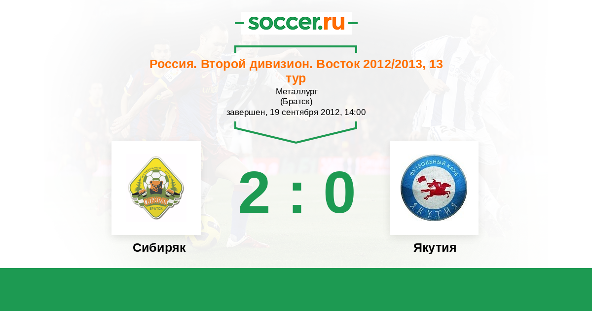 Россия. 2-й дивизион. Восток 17.09.2013 Сибиряк Логотип футбольный клуб Сибиряк (Братск) 1:1 Логотип футбольный клуб Якутия (Якутск) Якутия