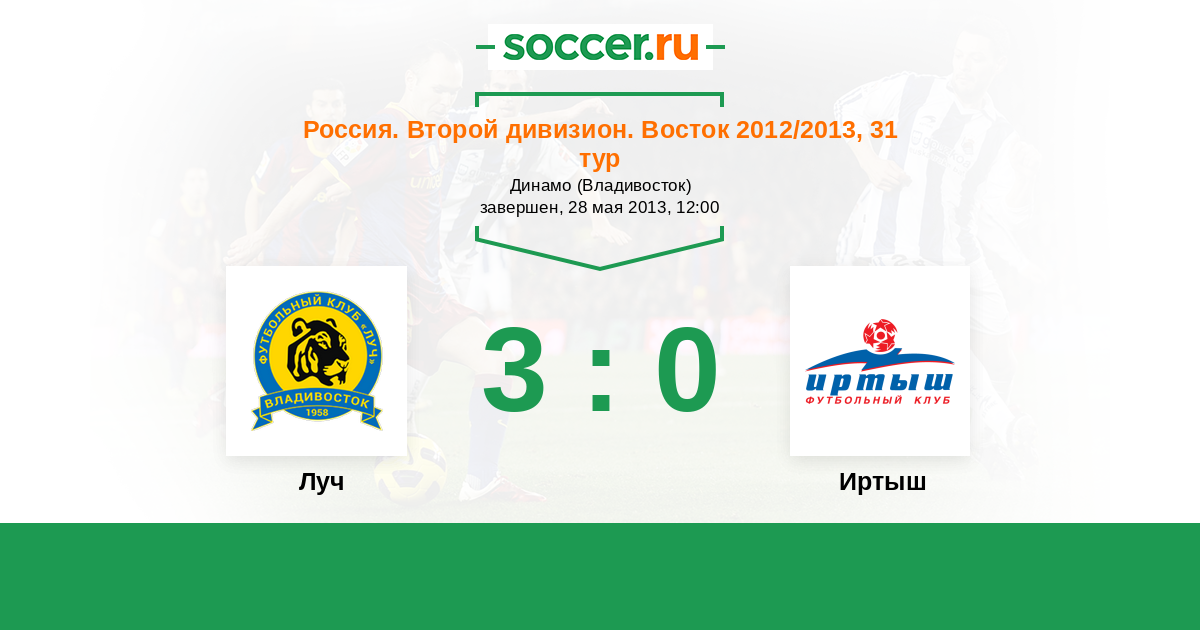 Россия. 2-й дивизион. Восток 27.08.2012 Луч Логотип футбольный клуб Луч (Владивосток) 3:2 Логотип футбольный клуб Иртыш (Омск) Иртыш