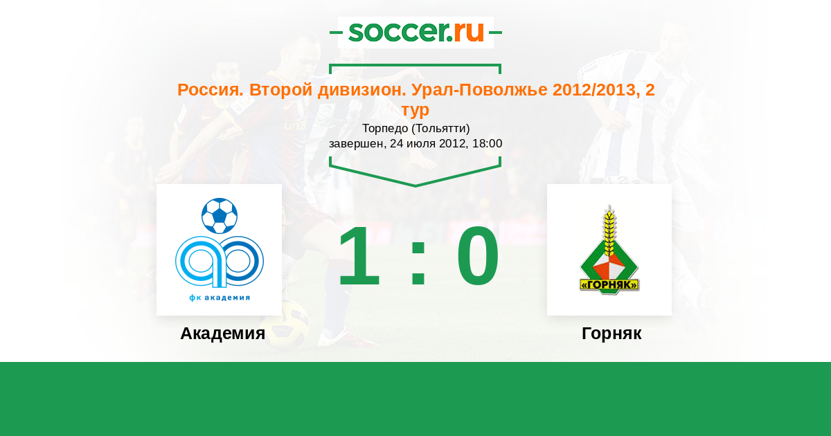 Россия. Вторая лига. Группа 4 20.10.2012 Горняк Логотип футбольный клуб Горняк (Учалы) 1:0 Логотип футбольный клуб Академия (Тольятти) Академия
