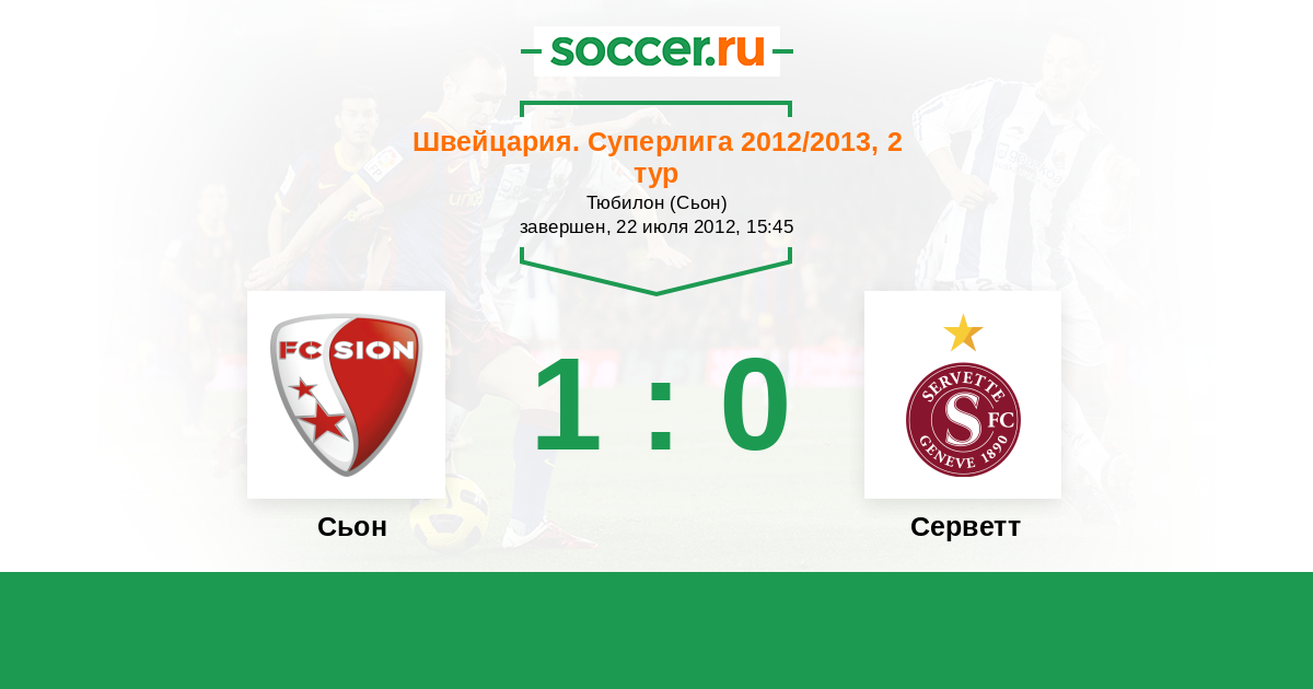 Швейцария. Суперлига 18.11.2012 Серветт Логотип футбольный клуб Серветт (Женева) 0:2 Логотип футбольный клуб Сьон Сьон
